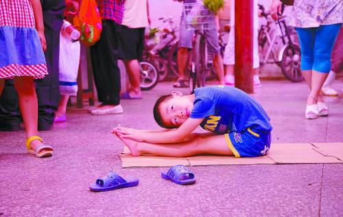 功泉在父母经营的摊档边练武术