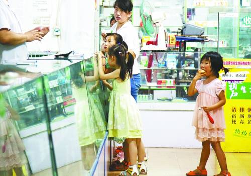 晚上,一位妈妈带着生病的女儿和她的玩伴在市场旁的药店买药。