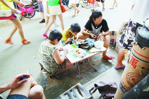 8岁的张俊硕(中)和妈妈一块儿吃晚饭,哥哥张俊熙(左)在饭桌上做暑假作业。平时妈妈带着哥俩在河南开封租房读书,暑假他们来北京和开杂货铺的爸爸以及爷爷、奶奶团聚。