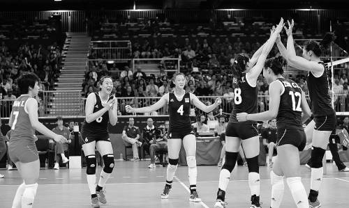 8月3日,中国队在伦敦奥运会女排小组赛中,以2∶3负于巴西队。图为中国女排队员在比赛中庆祝得分。