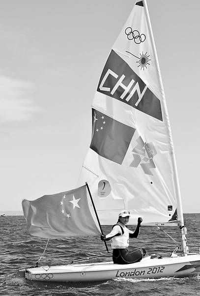 8月6日,徐莉佳手持国旗庆祝。当日,在韦茅斯-波特兰港举行的伦敦奥运会帆船女子单人艇-激光雷迪尔级奖牌轮比赛中,中国选手徐莉佳以35分的成绩夺冠。新华社记者 公磊摄