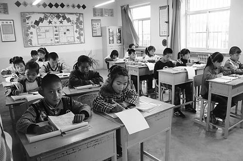 9月10日下午,陕西省府谷县武家庄乡高庄则小学四年级学生正在上课。从去年秋季起,府谷县实现了从幼儿园到高中的15年免费教育全覆盖;今年4月,又对义务教育阶段实行“零收费”政策,高庄则小学学生的吃饭、住宿等费用全免。实习生 郝帅斌摄