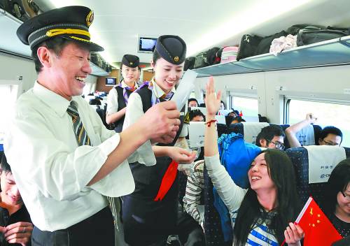 9月29日,何颖(前排左一)带领的铁路服务研讨小组成员向旅客发放问卷调查表,收集旅客的意见和建议。当日,在由北京开往上海的高铁G3次列车上,全国劳模、共和国铁路楷模何颖带领上海铁路局上海客运段的乘务人员,与广大旅客亲密互动,举行关于铁路常识等知识竞赛、征询旅客对高铁服务的意见,表演文艺节目等,共同庆祝即将到来的国庆节。