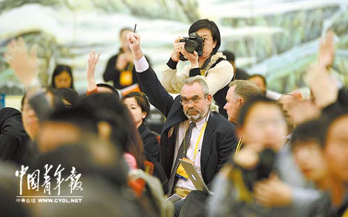 11月7日,中国共产党第十八次全国代表大会在人民大会堂三楼金色大厅举行新闻发布会,大会新闻发言人蔡名照向中外记者介绍十八大议程及有关情况。中外媒体记者踊跃提问。本报记者 刘占坤摄