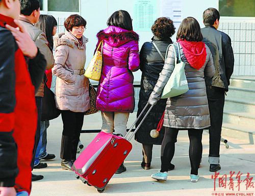 由于非通用语职位外语水平测试的考点只设在北京,不少考生和家长拖着行李从外地赶来。