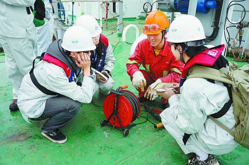 在“津平1号”抛石整平船上,大学生记者围聚在一起采访中国交建的现场技术人员。