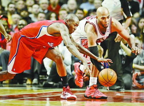 12月12日,NBA常规赛,快船队客场以94∶89击败公牛队,豪取七连胜。图为双方球员在争抢。