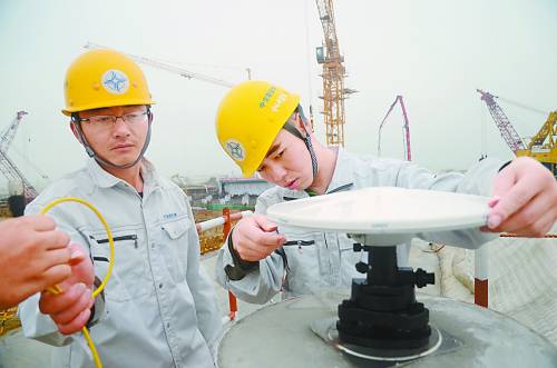 11月29日上午,港珠澳大桥岛隧工程项目部第五工区测量队副队长季浩华(右)在西人工岛调试测量设备。在港珠澳大桥岛隧工程项目部,像季浩华这样的“85后”占到相当的比例。