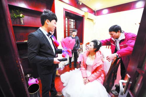 12月8日,杨锐(左一)在主持婚礼前向新娘叮嘱仪式上的细节。今年22岁的杨锐是宁夏大学广告专业大四学生,平时除了学业之外,他还有一项“甜蜜的事业”,那就是婚庆司仪。今年6月,杨锐自己靠3年勤工俭学积攒的钱在银川创办了一家庆典工作室,由于资金有限,他只能在银川的801文化产业创意园内和朋友的公司合租在一起。接近年底,杨锐接到的业务越来越多,他每天都要把本周的业务行程看一遍,然后准备下一场的主持词。