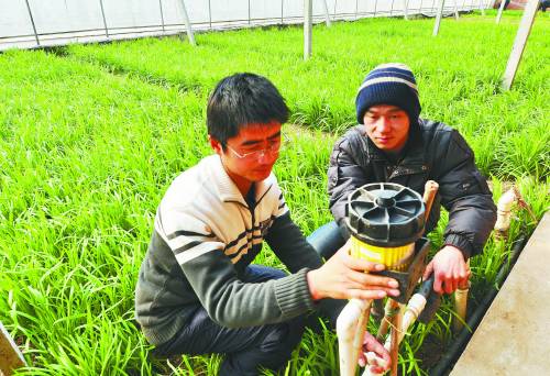 12月11日,5年前毕业于山东农业大学的武庆臣(左)和他的伙伴在维修节水设施。