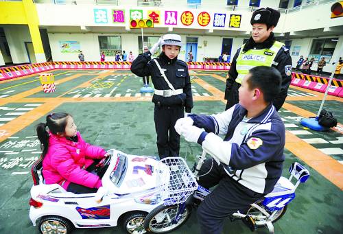 12月26日,“小交警”在交通实践体验场内学习处理“交通事故”。当日,位于济南师范学校附属小学校园内的新型“交通安全教育基地”正式投入使用。该教育基地由学校及交警部门联合设计建设,模拟城市中真实的道路基础设施及交通标志。
