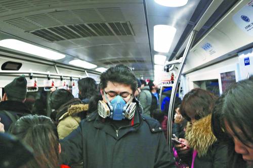 1月29日,北京地铁2号线上,一名乘客戴着防毒口罩。1月份以来第四次侵扰京城的雾霾顽固“盘踞”,28日、29日北京空气质量达六级,属严重污染,北京已启动更严格的污染防控应急措施。
