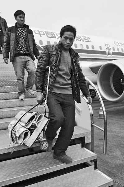 1月29日,几名农民工走下飞机。