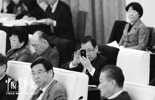 3月6日,香港代表团在人民大会堂香港厅举行全体会议,会上张明敏代表在用iPhone手机拍照。1984年春晚上,张明敏演唱的《我的中国心》,人们耳熟能详。有多年青年工作经验的张明敏表示,自己将借助全国人大代表这个平台,促进香港和内地的青年交流,并推动普通话在香港的普及。