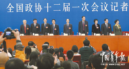 3月6日,全国政协十二届一次会议在北京人民大会堂举行记者会,民主党派中央和全国工商联领导人王钦敏、陈竺、韩启德、陈昌智、万鄂湘、张宝文、严隽琪、万钢、林文漪(从左至右)集体接受媒体采访时表示,随着我国政治体制改革的不断深化,中国共产党领导的多党合作和政治协商制度,必将在社会主义民主政治建设中发挥更大的作用。本报记者 郑萍萍摄