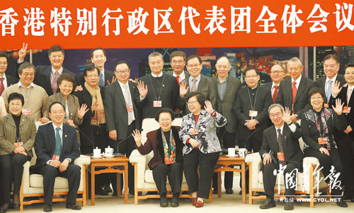 3月6日,香港代表团在人民大会堂香港厅举行全体会议,会后代表们合影留念。据香港媒体报道,全国两会召开,为香港提出更明朗的发展方向,有利于解决香港的许多实际问题,有助于香港更健康更快步向前发展。本报记者 陈剑摄