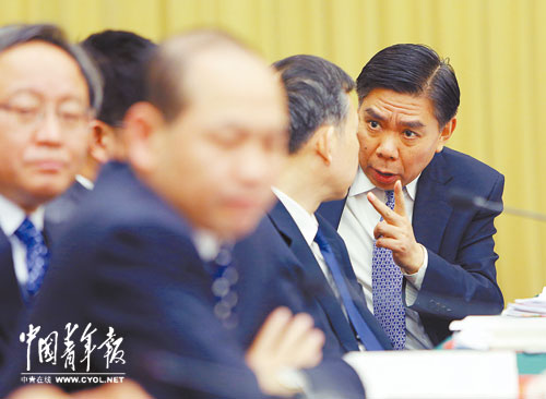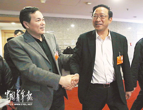 3月6日,全国政协委员、广西壮族自治区政府副主席陈章良(右)与钱克明委员握手。陈章良表示,广西应加快城镇化步伐,同时保持少数民族地区文化风貌。