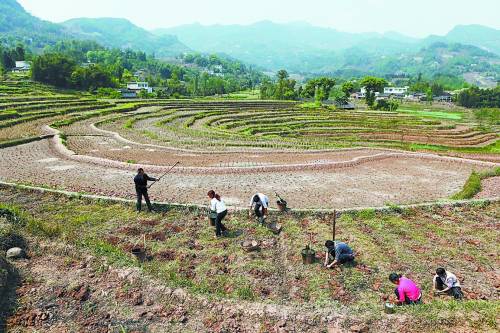 3月28日,在四川省宜宾市屏山县屏山镇洪坪村柿子组,村民们在干裂的水稻田里种玉米。