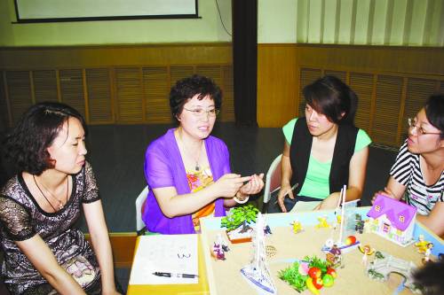 雨杉(左二)进行沙盘游戏培训
