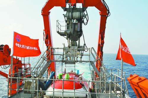 抵达南海海山区的“蛟龙”号(6月26日摄)。搭载“蛟龙”号载人潜水器的“向阳红09”船经过2天航行,于6月26日17时左右抵达南海海山作业区,继续执行首个试验性应用航次,具体下潜作业时间将根据作业区海况确定。