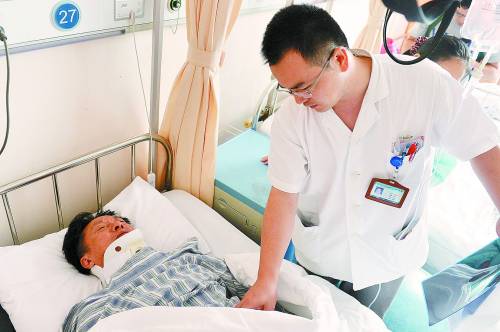 上海交通大学附属第三人民医院的医护人员(右)在为王建忠检查身体(7月1日摄)。
