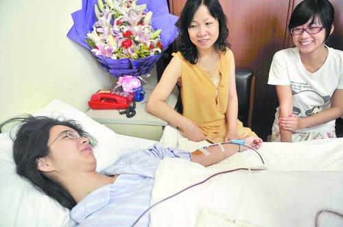 7月15日,在上海市第一人民医院,董骁燚妈妈(中)和同学陪正在捐献造血干细胞的董骁燚聊天。