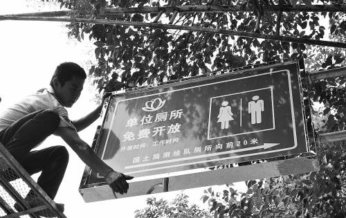 8月19日,工作人员在安装厕所免费开放标识牌。
