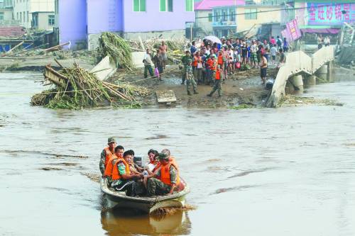 8月17日,辽宁省抚顺市清原满族自治县南口前镇,南口前村连通外界的桥梁被冲断,沈阳军区雷锋团官兵驾冲锋舟转运受灾群众。8月16日至17日,抚顺市遭遇特大暴雨袭击,截至8月19日5时,已有54人因灾死亡,97人失踪。