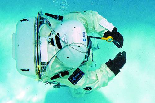 当地时间9月2日,法国马赛市,一名法国宇航员在游泳池内进行水下训练。CFP供图