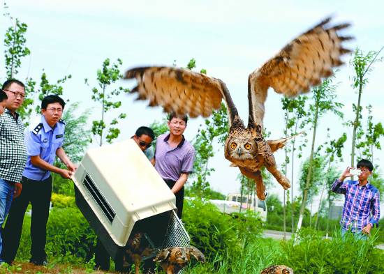 当日,河北省沧州市野生动物救护中心举行野外放归活动,环保志愿者把康复的36只国家二级保护动物——雕鸮、纵纹腹小鸮和红隼送到适生区放飞。傅新春摄(新华社发)