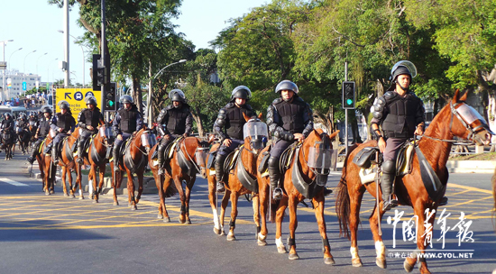 巴西世界杯期间,大批骑警保卫着世界杯场馆周边的安全。特派记者 刘占坤摄