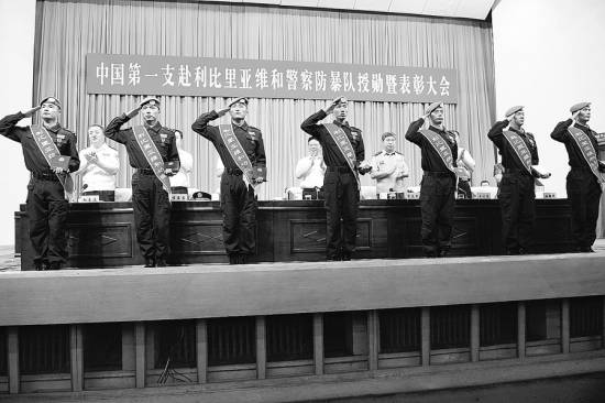 7月8日,中国第一支赴利比里亚维和警察防暴队授勋暨表彰大会在黑龙江省哈尔滨市举行。由黑龙江省公安边防总队为主组建的中国第一支赴利比里亚维和警察防暴队,以优良作风在短短9个月里出色完成了维和任务。黑龙江省副省长、省公安厅党委书记、厅长孙永波表示,在面临血与火考验的赴利比里亚维和期间,防暴队不负重托,不辱使命,向全世界展现了中国警察威武之师、文明之师、和平之师的良好形象,赢得了国际社会的广泛赞誉。授勋表彰大会上,孙永波为防暴队颁授“维和防暴英雄警队”荣誉称号奖旗。此次表彰大会由公安部、中共黑龙江省委、黑龙江省人民政府联合举办。