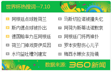 据360新闻世界杯热搜数据显示,荷兰门神戏耍伊瓜因、马斯切拉诺被撞失忆、双方赛前为刚刚去世的足坛名宿迪斯蒂法诺默哀、阿根廷门将两次神扑、罗本安慰伤心儿子等焦点事件,成为当日热搜话题。