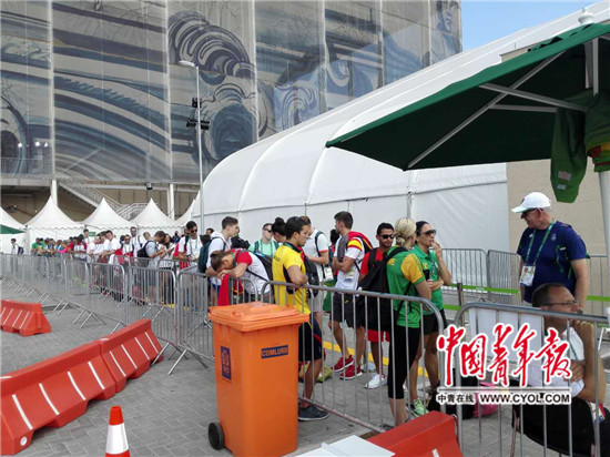 记者在里约奥林匹克公园附近的里约二号公交车站,看到了绝不亚于北京早高峰天通苑地铁站口的排队巨龙。