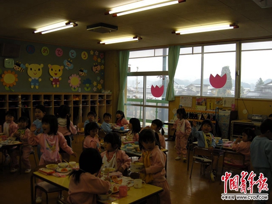 日本家庭的餐桌,很少奢华,通常都十分清淡简单。这种饮食习惯,他们从孩子在幼儿园时期就开始着意培养了。小朋友的餐盘里,摆放着由营养师按所需营养比例搭配的肉食、蔬菜、水果,各样一点点,色彩很丰富。孩子吃米饭,老师、家长叮嘱孩子只需吃得八分饱,不要吃饱吃撑。