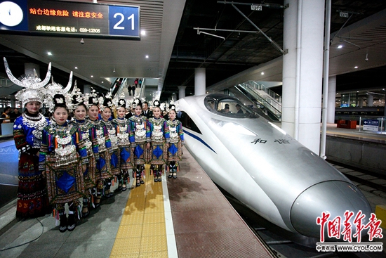 12月28日,沪昆高铁西段正式通车,11时20分,首趟G4135列车从贵阳北站发车,13时45分准时抵达昆明南站。全程运行2小时25分。这标志着沪昆高铁全线贯通。沪昆高铁全线贯通极大地缩短了云贵高原与京津冀、长三角、泛珠三角等地区的时空距离。在G4135列车发车现场,身着少数民族服装的乘务员在贵阳北站站台迎接旅客,全列车乘务员均为布依族。中国青年报·中青在线记者 白皓/摄