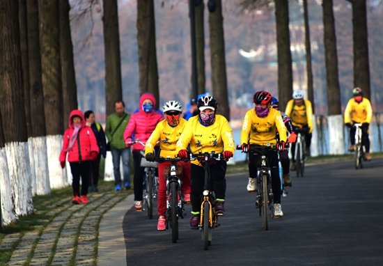 12月28日,市民在东湖绿道骑行。12月28日,被誉为“世界级绿道”的武汉东湖绿道正式开通,全长28.7公里的东湖绿道一期工程串起城中湖沿线风景区。武汉东湖绿道分为湖中道、湖山道、磨山道和郊野道四条主题绿道,将面积36平方公里的东湖几大风景区连为一体,全程禁止机动车通行,成为市民徒步、骑行的好去处。新华社记者 程敏/摄