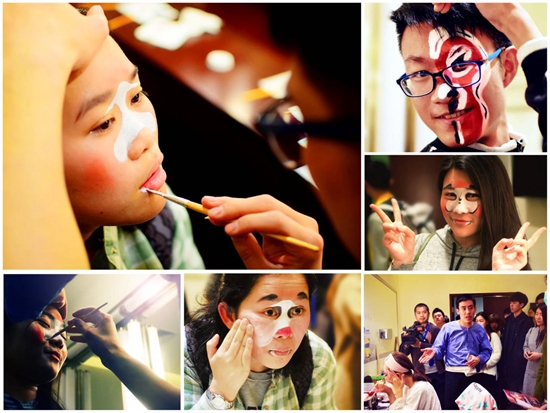 化妆间里,学生们不仅目睹演员是如何一笔一划勾出京剧中奥妙独特的脸谱,还亲自体验了一把京剧脸谱化妆。猴脸、金钱豹、三花脸等京剧角色脸谱在大学生的脸上被仔细勾画出来,现场师生纷纷拍照留念。