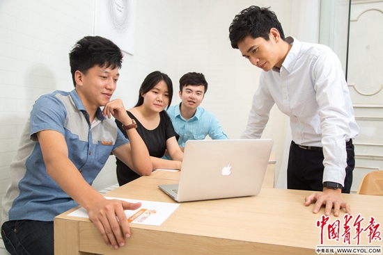 •     广州九尾信息科技有限公司创始人王锐旭(右一)在工作中