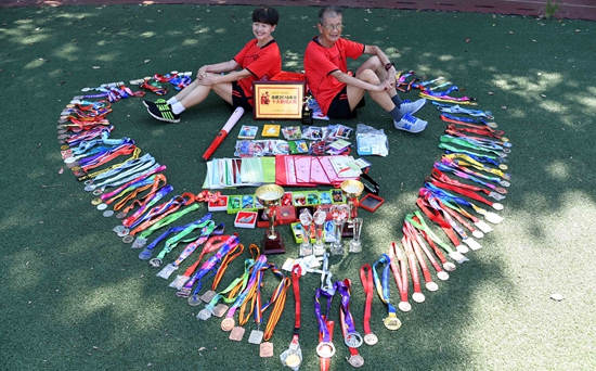 8月23日,80岁的胡应福(右)和71岁的王章敏展示多年来参加马拉松比赛的奖牌及奖章。当日,安徽合肥市常青街道金寨南路社区为胡应福和王章敏夫妇举办“浪漫七夕 跑马伉俪”金婚纪念活动。新华社记者 刘军喜/摄