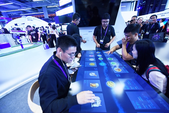 10月11日,参观者在“未来智能餐厅”的触屏餐桌上体验隔空点餐。