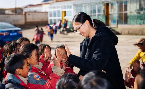11月17日,在甘肃省甘南藏族自治州碌曲县郎木寺镇波海小学,吴桐雨与学生互动。吴桐雨是甘肃省兰州城市学院大四学生,在该小学支教。据甘肃省教育厅介绍,从2015年起,甘肃省已完成了1200名学生的顶岗支教任务。新华社记者 刘金海/摄