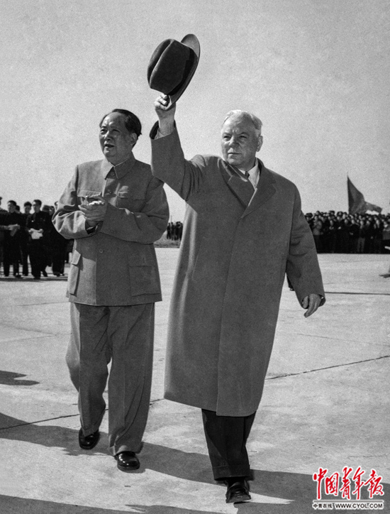 1957年4月15日,毛泽东和访华的原苏联最高苏维埃主席团主席伏罗希洛夫在北京南苑机场向群众致意。铁矛/摄