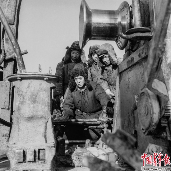 1964年2月,黑龙江省大庆油田,王进喜把技术教给青年钻工。1966年,王进喜领导钻井队创年进尺10万米的世界钻井纪录。铁矛/摄