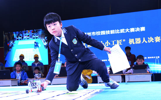 “展技能风采·做小小工匠”首届郑州市校园技能比武大赛机器人决赛在郑州市商业技师学院举行。来自郑州市各区(县)的84名参赛小学生围绕智能物流主题,搭建机器人进行图纸分析、列编程调试、模拟实验等一系列操作。