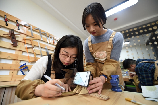 宋乐乐(前右)在木艺工作室里帮助体验者绘图(1月10日摄)。