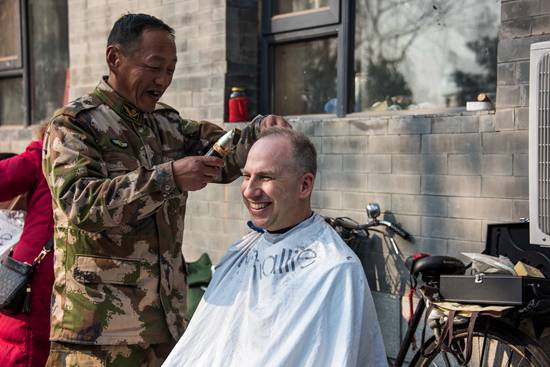 3月18日,北京后海一条胡同,一个“老外”正在理发,他说懂得中国人的习俗,因此主动要求理发。农历二月初二,人们祈望龙抬头兴云作雨、滋润万物,素有“二月二剃龙头”的说法。每逢这一天,家家理发店都是顾客盈门。视觉中国供图