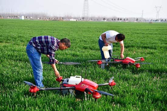 时下正值春耕,“90后”青年王超运(右)在河南省遂平县四处遥控植保无人机帮种粮大户打药,他有个时髦的称谓:“绿领”创客。王超运是河南省宁陵县人,高中毕业干过物流、做过销售,去年他到遂平县加入河南省八佰家农业服务专业合作社,花11万元购买了2台无人机,从事无人机植保。“绿领不同于城市白领、蓝领,我们是从事现代农业的新型农民。”王超运说。 新华社记者 冯大鹏/摄