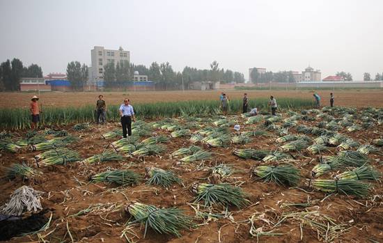 2017年9月25日,河北雄安新区容城县仇小王村南,村民提前一个月收割大葱,为合作造林用地做准备。新区选定这里的175亩地块作为合作造林实验区,计划造林1万亩。葱农可获得每亩地每年1500元的租地补偿、每亩大葱9000元的青苗费补偿等。同时政府帮助葱农拓展销路、低价销售,大葱并未出现滞销现象。如今,这片农田已种满小松树林。