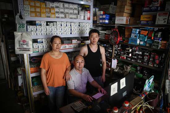 2017年7月28日,余治晓(中)与一家人在自家的标准件门市。上个世纪90年代初,他携妻子来到雄县打拼,儿子出生后,为其取名“雄飞”。